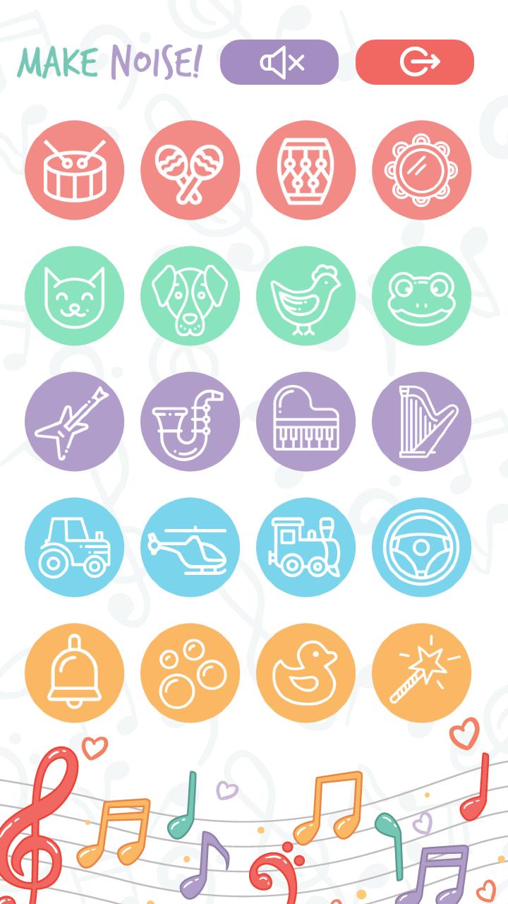 該應用程序使您的孩子可以發出不同的聲音:動物,運輸,自然,樂器的聲音。按下一個按鈕 - 獲取新的聲音!